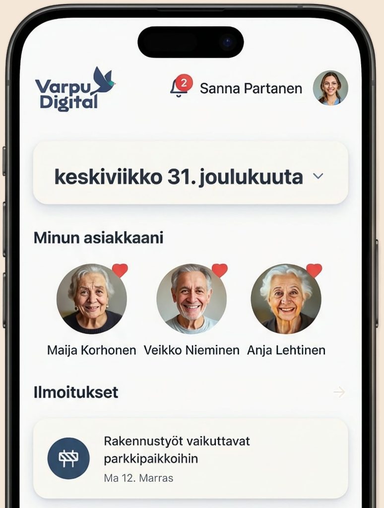 Varpu Digital™ on mobiilisovellus, joka yhdistää omaiset, asiakkaat ja hoitohenkilöstön saumattomaan viestintään sekä tukee työntekijöiden osaamista ja työssä oppimista helposti saatavilla olevilla toimintamalleilla ja perehdytysohjeilla.