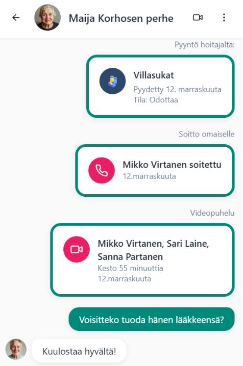 Varpu Digitalin Omaisviestintä kokoaa omaisten, hoitajien ja hoivayksikön kaiken vuorovaikutuksen yhteen helppokäyttöiseen näkymään. Palvelu vähentää puheluja ja epäselvyyksiä, parantaa palautetta ja lisää omaisten luottamusta hoivaan – reaaliajassa ja turvallisesti.