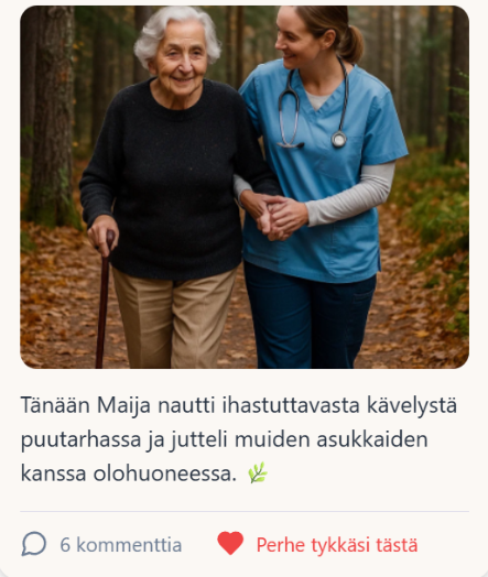 Hoitaja voi lähettää kuvia, viestejä ja lyhyitä terveisiä, jotka antavat omaisille konkreettisen kuvan läheisen voinnista ja päivän tapahtumista.